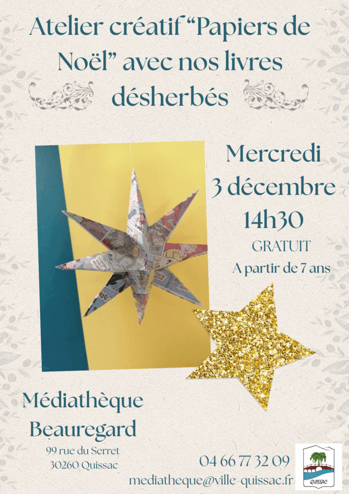 – Atelier « papiers de Noël » avec nos livres désherbés le 3 décembre à 14h30, à partir de 7 ans