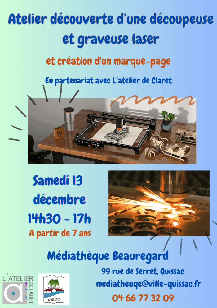 – Atelier découverte de la découpeuse et graveuse laser avec l’atelier de Claret le samedi 13 décembre à 14h30