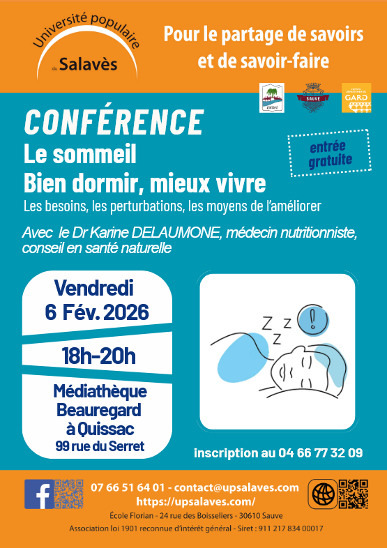 – vendredi 6 fév. : conférence sur le sommeil 18h-20h avec UP Salavès – Université PopulaireSauve – La MairieConseil départemental du Gard