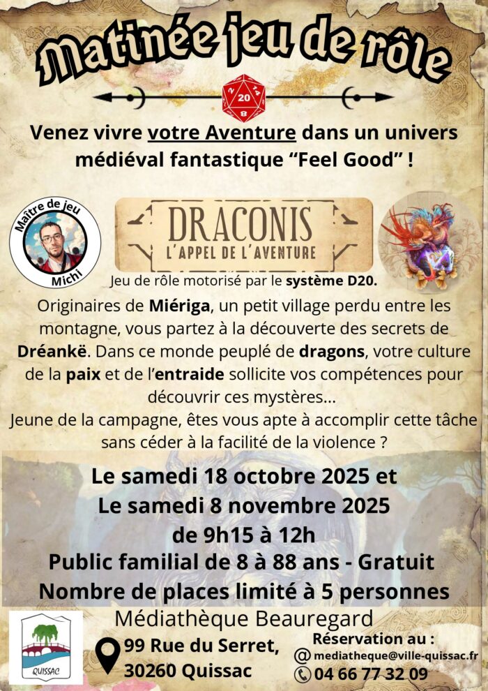 - Samedi 8 Novembre à 9h15 – atelier très prisé, places limitées- Draconis :