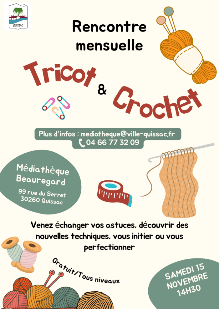 - Samedi 15 novembre à 14h30 – Atelier Tricot venez avec votre matériel