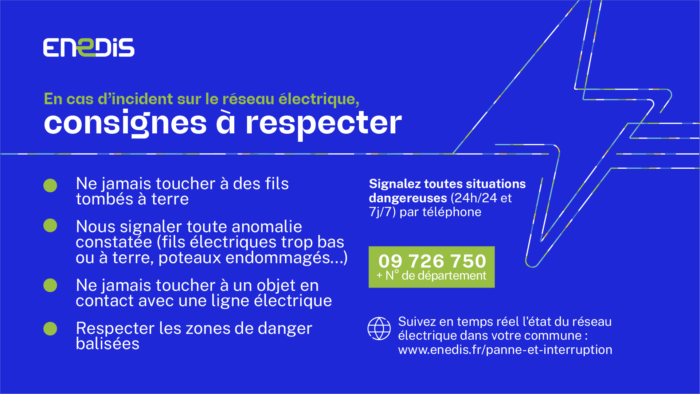 Dans le cadre de la tempête BENJAMIN actuellement en cours sur le territoire français, Enedis souhaite vous rappeler les consignes de sécurité à respecter en cas d’incident sur les réseaux électriques.