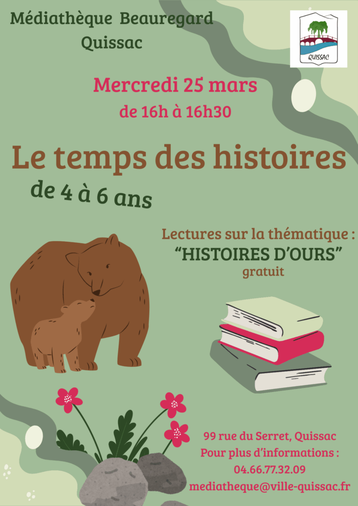 –  Lecture pour les 4-6 ans « Histoires d’ours » le mercredi 25 mars à 16h