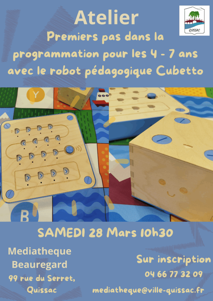 – Découverte du code pour les petits, avec le robot pédagogique Cubetto, le samedi 28 mars à partir de 10h