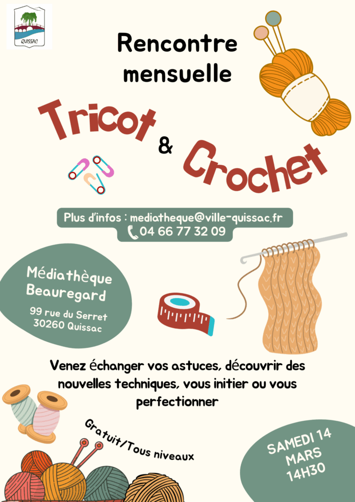 – Atelier Tricot et crochet samedi 14 mars à 14h30