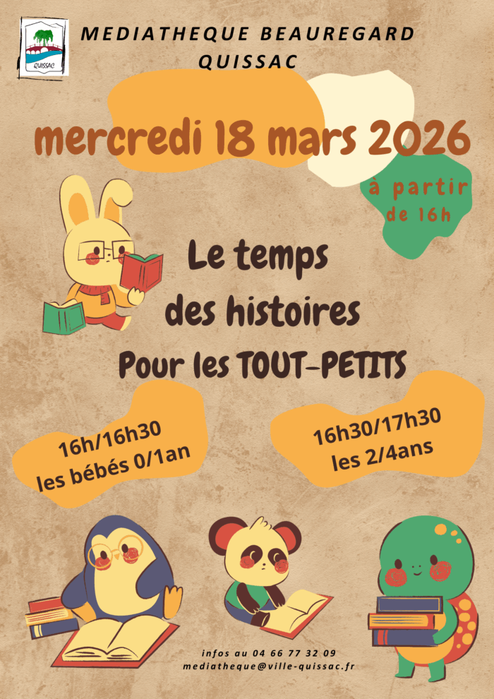 Pour plus d’infos sur l’actualité de la médiathèque, n’hésitez à contacter nos bibliothécaires au 04 66 77 32 09 aux heures d’ouverture de la Médiathèque ou par mail : mediatheque@ville-quissac.fr .