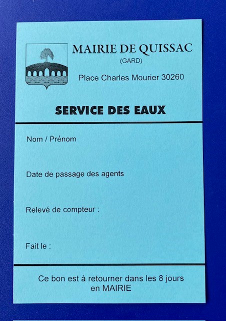 – Si l’accès au compteur est impossible, l’agent laissera un avis de passage, coupon bleu, à retourner en mairie ou par mail : eau@ville-quissac.fr