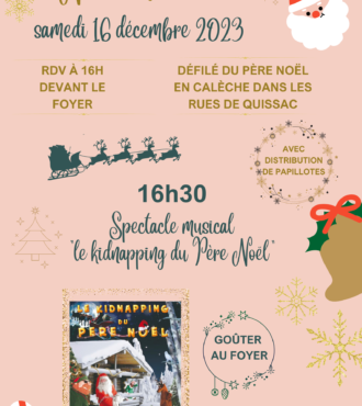 Le noël dans les rues de Quissac : défilé en calèche dans les rues du centre ville … goûter au foyer et spectacle « le kidnapping du Père Noël » .